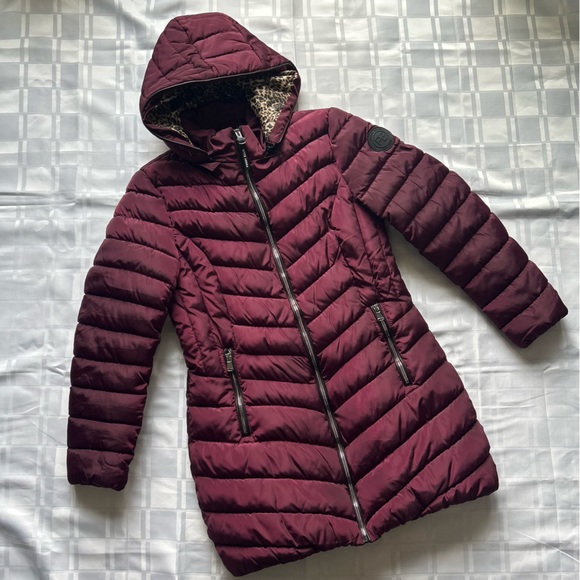 Perry Ellis Portfolio jacket, in excellent condition. Puffer style, zippered fleece lined pockets, removable zippered hood, leopard print interior lining. Marked size small.