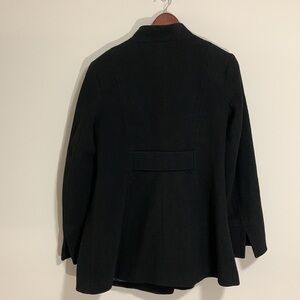 Front buttons / option to button up to neck or open / two side front pockets / slats at wrists / stitch detail at interior where lining meets wool exterior / belt at Center back.