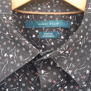 Perry Ellis SZ M Black w/ White & Salmon Print Men's Button Up Cotton Shirt
