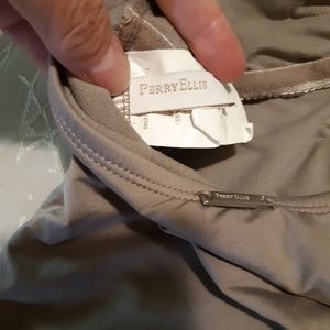 Perry Ellis Taupe Ruffled low cut neckline. 1pc Swimsuit Size 6. Ties at the back of the neck. Condition is very good. Measurements are approx and can be viewed in the photo section. Feel free to contact me with any questions that you may have, put a bundle together and I will send you a offer so you can save even more money. Thank you.