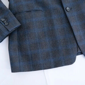 Featuring an elegant grey-blue checker pattern, this three-button, 100% wool blazer was crafted with impeccable attention to detail and is sure to make an impressive statement with its classic silhouette and structured fit.