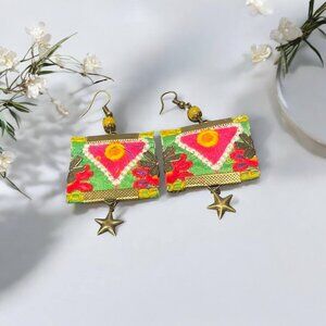 Embroidered | bohemian style earrings, Persian Jewelry, Balochi Upcycled Textile Earrings | pink and grean
