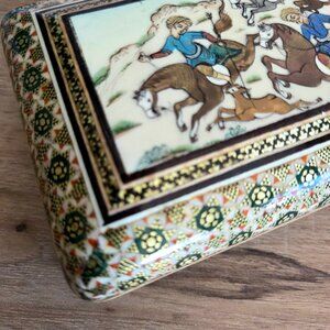 Persian wooden handcrafted hand painted inlaid Khatam Kari Marquetry lacquered jewelry box with hunters theme.
