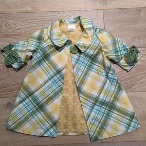 Green and yellow Persnickety fashion jacket. Bows on side arms, one button. Excellent condition, size 4T.