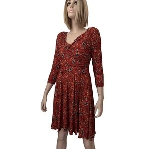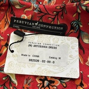 Features: Invisible side zipper, brightly handpainted native Peruvian flowers pop against the red/sienna background. Shaped to flatter, Draped and Ruched crossover bodice fits as a wrap/crossover bodice, twirlable skirt proffers a flowy movement; roomy pockets at each front side, ΒΎ sleeve, lined bodice, stretch fabric bodice