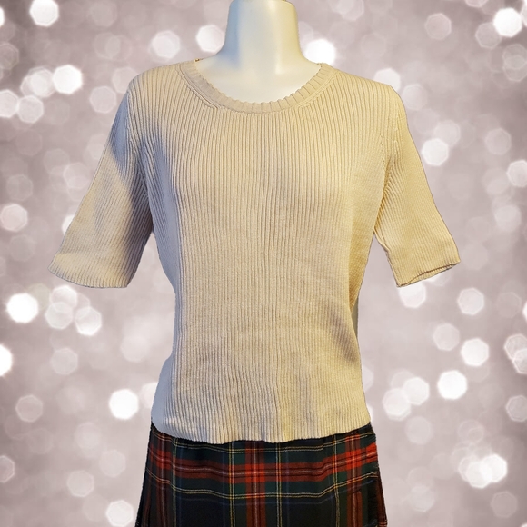 Stylish cream ribbed knit sweater with short sleeves. 100% Pima Cotton.