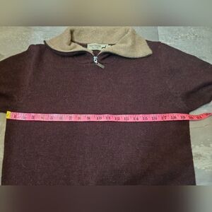 Peruvian Link "Auckland 1/4 zip sweater. 100% alpaga. Heathered burgundy & black. Tan touch aroundthe collar and cuffs areas. Men size S, see pictures for measurements. Fabric is stetchy, comfy and soft. Small hole has been repaired at the front as seen on picture. No stain. Not shrunk. Non smoking house.