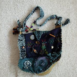 This was purchased at a market in Peru when I was travelling there. Its base is made up of a straw material and each side panel is an eclectic collection of various materials, buttons and charms.