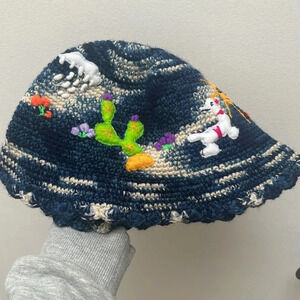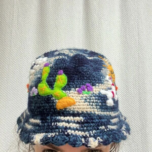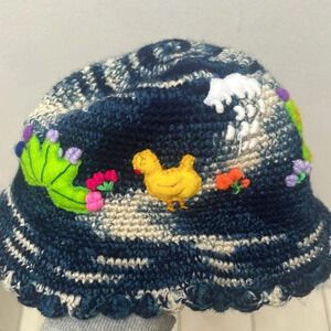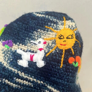 Peruvian hand knit wool bucket hat with appliqué embroidery, blue and white