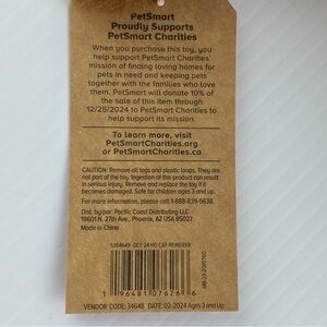 PetSmart Fortune Squeaker Toy. Reindeer. 100% polyester. Large brown plush with gold antlers and feet. Small squeaker inside chest / neck. Approximately 11 inches. Safe for children 3 and up.