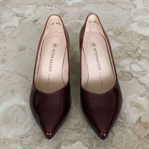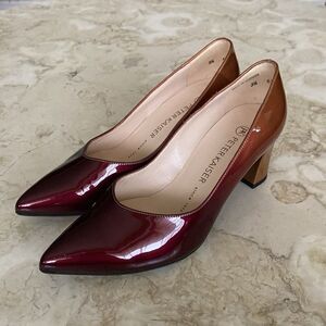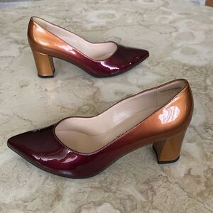 In as new condition gorgeous Peter Kaiser pumps, made in Germany. Patent leather with striking ombré effect running from a burgundy front to a gold tone at back. Super cool!