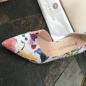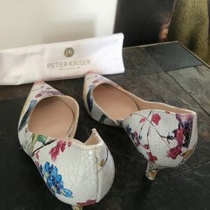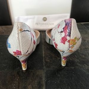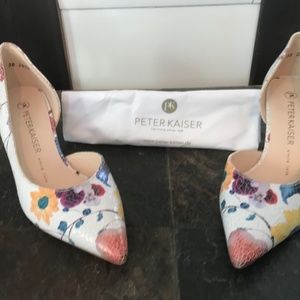 Peter Kaiser crackled leather pumps with cut out to inside of pumps. Never worn, like new. White with distinctive floral colours. Pointed toe, very classic pump.