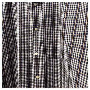 Pit to pit 27" length 33" Crafted for the discerning gentleman, this Peter Millar long sleeve button-up shirt offers a timeless gingham pattern in a sophisticated dark blue and brown palette. The shirt is designed to cater to a regular fit, ensuring both comfort and style for the wearer.With a size of XL, it's ideal for those who appreciate a tailored look without compromising on ease of movement. The shirt's versatile design makes it suitable for a range of occasions, whether you're dressing up for a casual outing or adding a touch of class to your everyday wear.