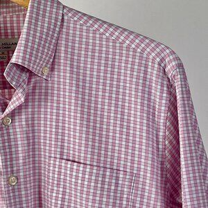 Beautiful lightweight button down shirt, in the finest cotton, from Peter MIllar's Summer Comfort line. So soft and comfortable, with a tiny bit of spandex, so it has a little stretch. Two tone pink gingham check with a blue hairline on a white background is a classic, and goes with everything. Single pocket at left chest. Shirt tail hem.