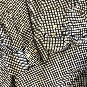 FEATURES: Black and white checkered square pattern. May be Hanford Performance Twill Sport Shirt or similar.