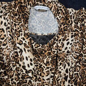 This Peter Nygard Leopard print Cowl Neck Sweater is super soft and hangs beautifully on the body. It is 93% Rayon and 7% Spandex. It is a size medium. A Black Lace center section sits beautifully in the Centre of the Cowl adding elegance. This top is incredibly comfortable and very flattering. It is 27 inches long. Machine wash gentle cycle in cold water and lay flat to dry.