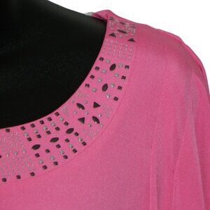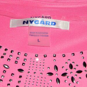 Details: This listing is for a pre-owned “Nygard” 3/4” Cape Blouse with Asymmetrical Hem and Metal Studding Detail Scoop Neck Collar Tunic in a size Large. This blouse has a pink sleeveless tank top underneath that is the same color as the cape fabric over it as seen in photos