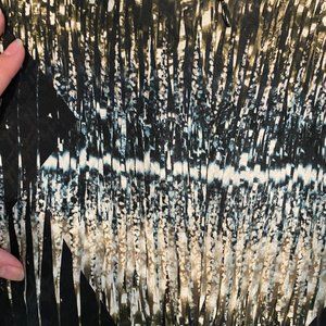 Fitted capped sleeve (very short, almost sleeveless) printed silk dress with hidden back zipper, high scoop neck, and defined waist. Loosely ruffled high/low hem, sometimes described as a "handkerchief hem". As seen on the Duchess of Wessex in 2012, a very similar one worn on Gossip Girl. Used but in unworn condition. I believe it was originally made in 2012, but I am not sure of the exact date. Clean, no stains, pulls, scents etc. Interesting contrasting pattern and sort of oil-slick colours - looks really striking in a photo.