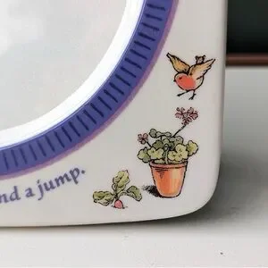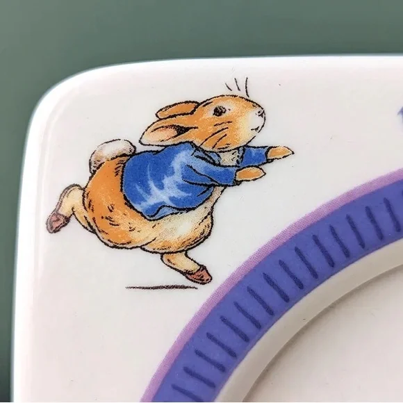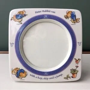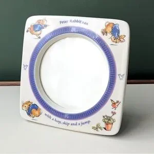 Display your cherished memories with this charming Peter Rabbit ceramic picture frame. Featuring delightful illustrations and a classic white and purple design, it's perfect for adding a whimsical touch to any room.