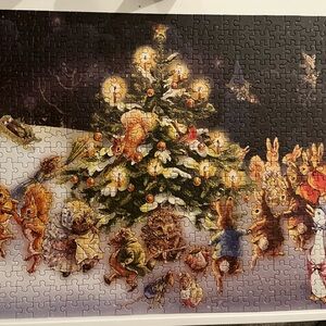 500-piece jigsaw puzzle featuring Peter Rabbit around a Christmas tree. Perfect for holiday fun.