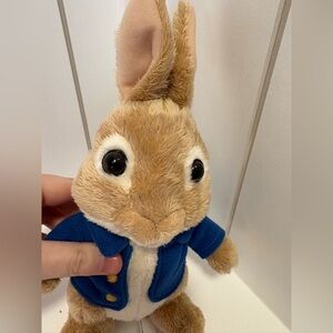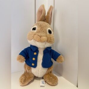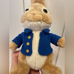 Adorable peter rabbit toy wearing a blue jacket.