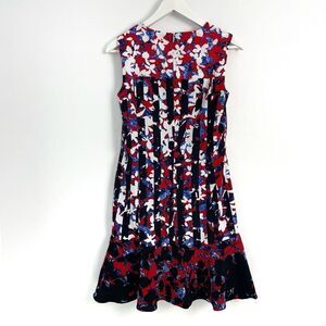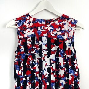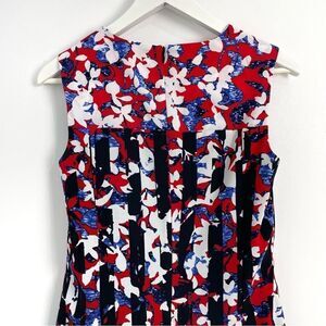 Sleeveless above the knee length dress with fluted hem by Peter Pilotto for Target . Red, black , blue and white abstract floral print all over . Back zipper closure. Fully lined .