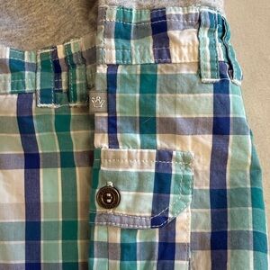 Gray top with blue hood. Blue and green plaid shorts. Button-up front. Short sleeves.
