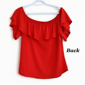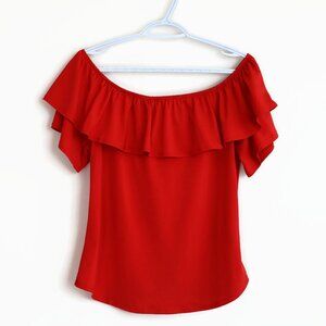 Feminine red ruffle top from Cleo. Wear it off or on the shoulder.