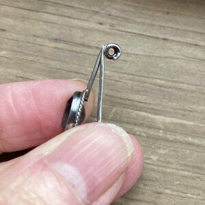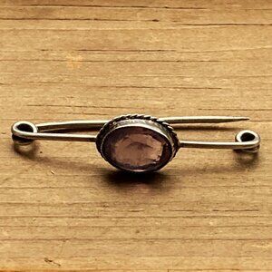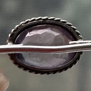 So small, simple and elegant, this pin measures about 1-3/8 inches across. The faceted amethyst is about 1/4 inches across, including the finely detailed frame. I don't know the age of the piece, and I've never seen this kind of clasp, which is a variation on that of a safety pin. There is a mark of 950 or 955, so purer than the sterling silver standard. This is a piece that looks great both because of and in spite of its age - the back of the pin is slightly bent, but this won't be visible when wearing, and if I look under a jeweller's loupe, I can see a couple of superficial scratches on the stone.