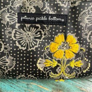 Adorable Petunia Pickle Bottom bag. It has multiple compartments inside its black lining..zippered compartmt in the back, snap in front & a zippered compartment on each end. Measurements 16x9x6. Vinyl fabric.