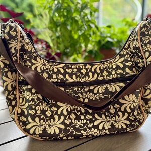 Petunia Pickle Bottom diaper bag in brown and cream print