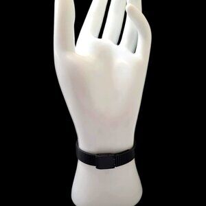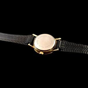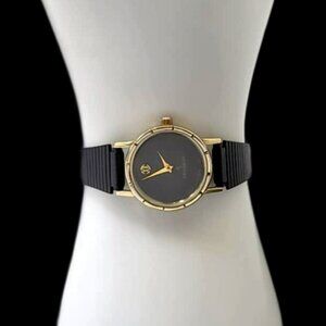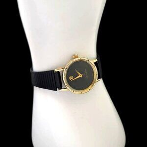 Refurbished with brand new crystal and stainless steel Kreisler band (band can be changed to any in-stock leather, metal, mesh, nylon or rubber band free of charge-message me with your preference)-Peugeot quartz analog simple classic black with gold hands and no markers. Excellent running condition. Case 23mm. Band 12mm tapers to 10mm. Current band measures 8" adjustable down with adjustable slider.