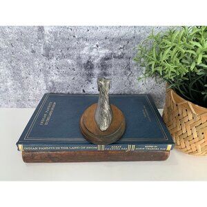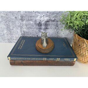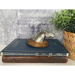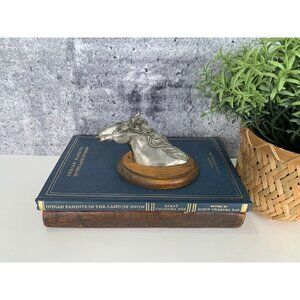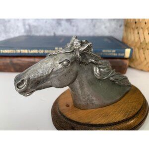 A beautifully crafted pewter horse head on a piece of wood. This figurine is small and simple yet the details in the pewter are lovely.