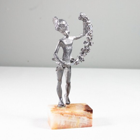 A cute figurine, stood on a piece of pink / brown alabaster? There are marks on her back so I suspect she used to have wings.