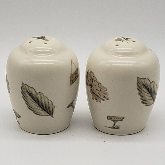 -Lovely botanical salt & pepper shakers in a soft, natural color palette with potted herbs, birdhouse, watering can and other gardening accessories and leaves adorn a flecked light cream background; made of stoneware material