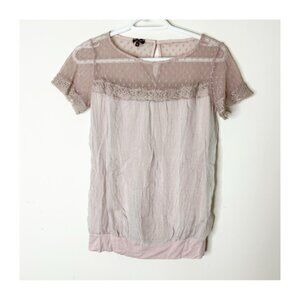 The clothing item is a mauve sheer short-sleeve top/blouse with lace trim and polka dot mesh detailing.