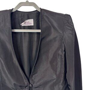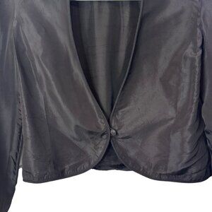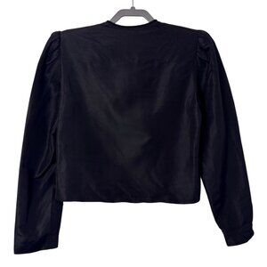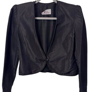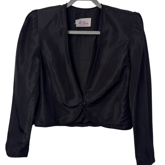 A black, long-sleeved bolero jacket from the brand Phil Carry. The style is characterized by its cropped length, V-neckline, and single-button closure at the waist. The fabric is made from viscose blend. The style can be worn for formal occasions or parties.