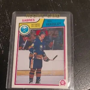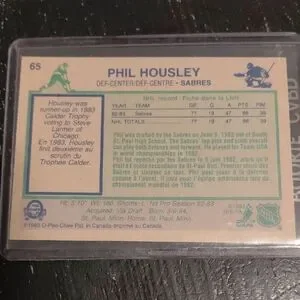 Phil Housley rookie card featuring him in a blue and yellow uniform.