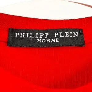 This t-shirt from Phillip Plein is crafted in a red jersey, and is embellished with a rhinestone skull on the back. It features short sleeves, a crew neck, an enamel chest patch with saffiano-textured leather trim; and ribbed finishing on the cuffs, neckline, and banded hem.