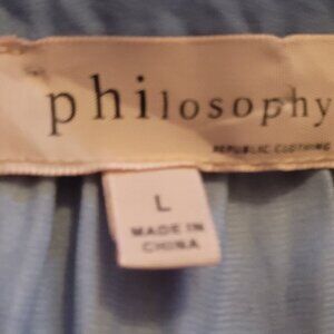 Philosophy blouse is a beautiful blue, with ruched 3/4 length sleeves that are adjustable with ties.