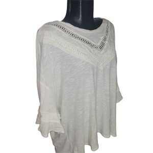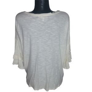 Elegant women's top featuring a delicate lace trim cutout. Also has a double ruffled short sleeves.