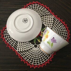 Very good preowned vintage condition, white porcelain/bone china teacup and matching saucer set featuring hand painted flowers in purple, yellow, red, green, and pink gilt gold rims by Phoenix of England. This is a very unique set. One of a kind and made with the careful craftsmanship of a talented person, capturing a moment in space and time.