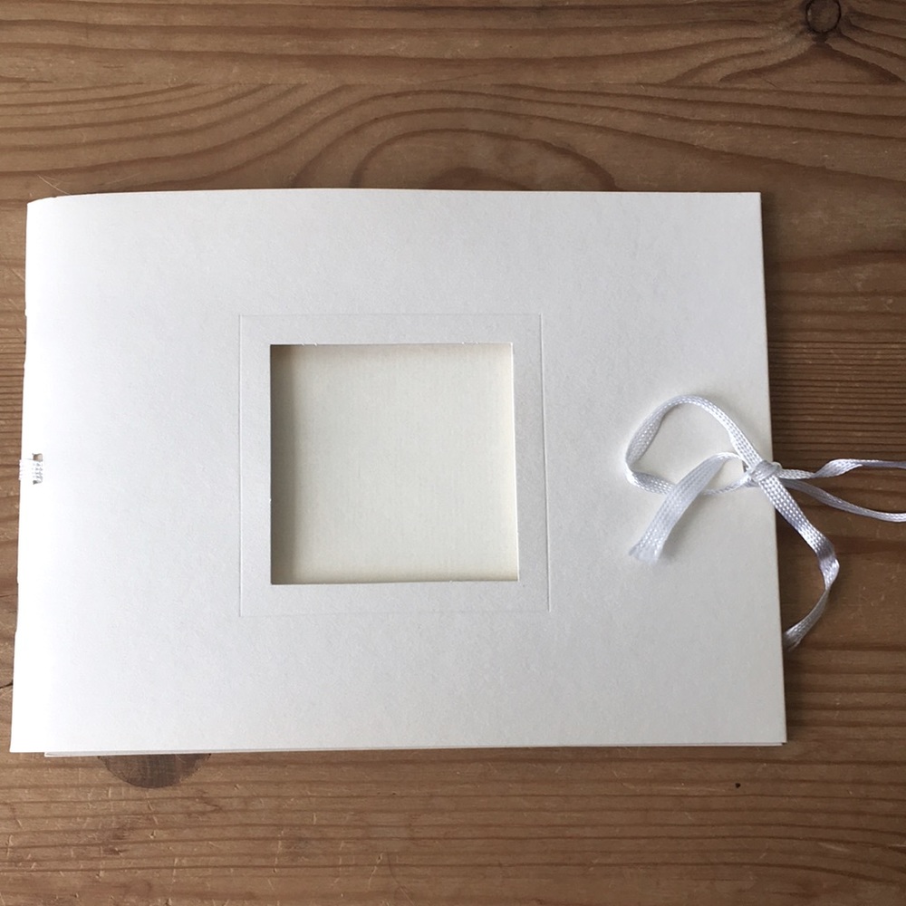 The Photo Booklet in Landscape Format with card stock cover and cover window. There is space for up to 20 photos (15 x 10 cm) on the 10 sheets of cream-coloured hand-made paper. With matching ribbon tie.