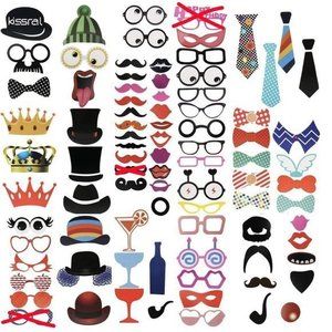 Funny package for party and birthdays!!! 86 differents photo props to make great memories. Homemade speech custom bubble. You can write on both side of each one with the white liquid chalk pen included. Can easily erase with water. There is 3 missing (see red X on the 3rd picture) Fabric black and gold Happy birthday background. Include brand new crown for the king of the party!!!