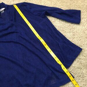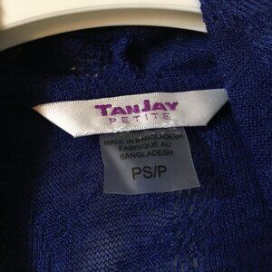 Very good preowned vintage condition, 3/4 sleeve, lightweight, interesting floral-like mesh knit, open waterfall cardigan in bright phthalo blue by TanJay. A lovely piece with a unique knit pattern.