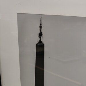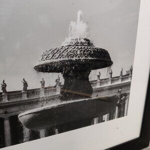 Elegant black and white framed print featuring a striking architectural scene. The photograph captures a tall, slender obelisk standing prominently against a bright sky, juxtaposed with an ornate, multi-tiered fountain with water cascading from its upper levels. The background reveals classical architectural elements, including a colonnade lined with statues. This sophisticated piece would add a touch of timeless elegance to any decor. The print is professionally framed in a simple black frame, ready for display.