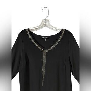 Elevate your wardrobe with this chic tunic, featuring a sophisticated black design. This tunic showcases a layered hem and eye-catching rhinestone embellishments along the neckline, adding a touch of glamour. The three-quarter sleeves offer a flattering fit, making it perfect for both casual and special occasions. Its versatile style ensures it pairs well with a variety of outfits, providing a seamless transition from day to night. Excellent condition π / π / Made in Canada π¨π¦