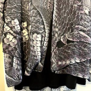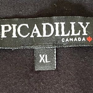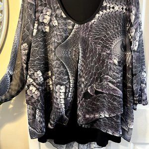 Picadilly, gray, black and white tunic 2 layer blouse. Front has a slit to allow the bottom black layer to peek though. 3/4 sleeves and round neck. Front has 2 panels on each side which are attached as one piece (left and right).