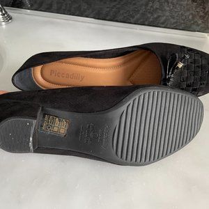 These two-inch heels by Picadilly in size 9 (40) feature a generously cushioned footbed for comfort and a rounded square toe. Fabric and man-made interior, faux suede exterior. Toe features a basket weave detail with bow and gold tassel.