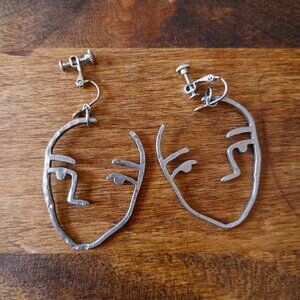 Picasso Face style Clip On Screw Back Silver-tone earrings - boho chic modernist